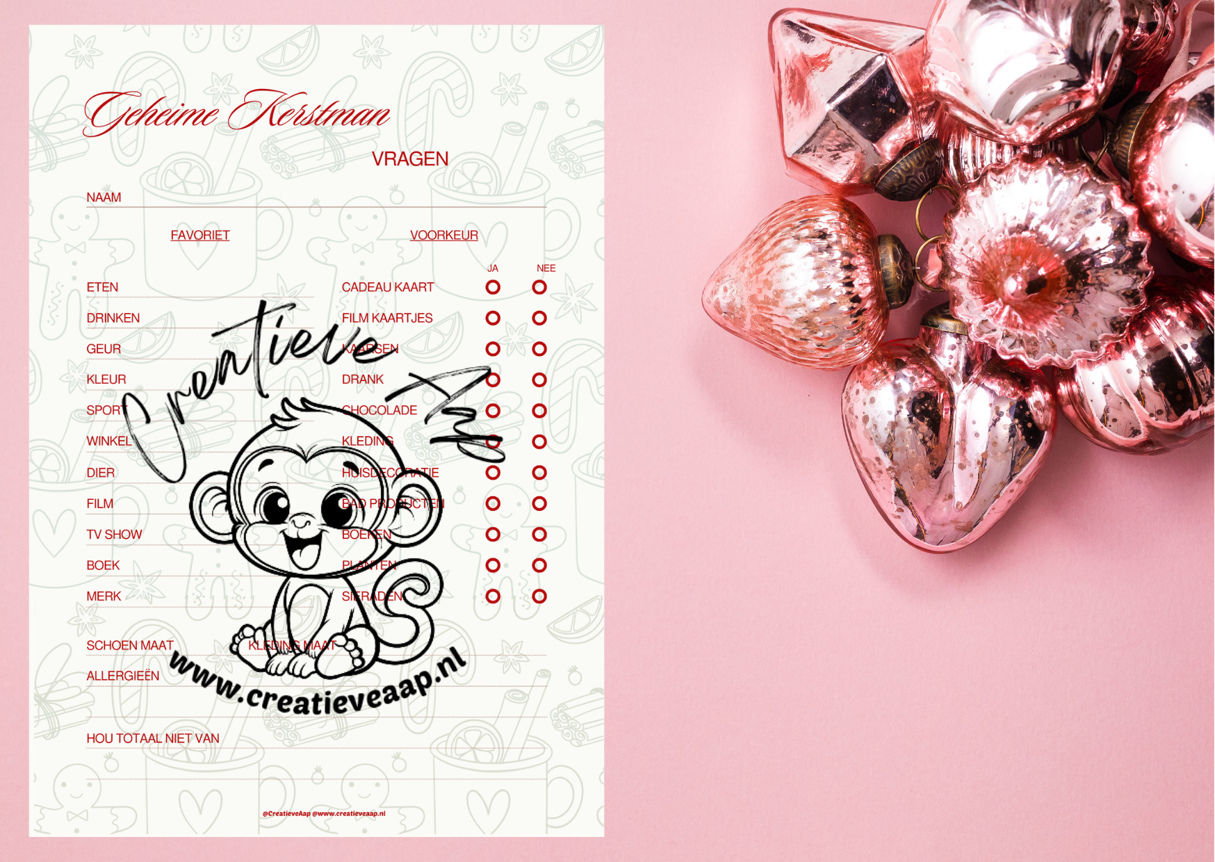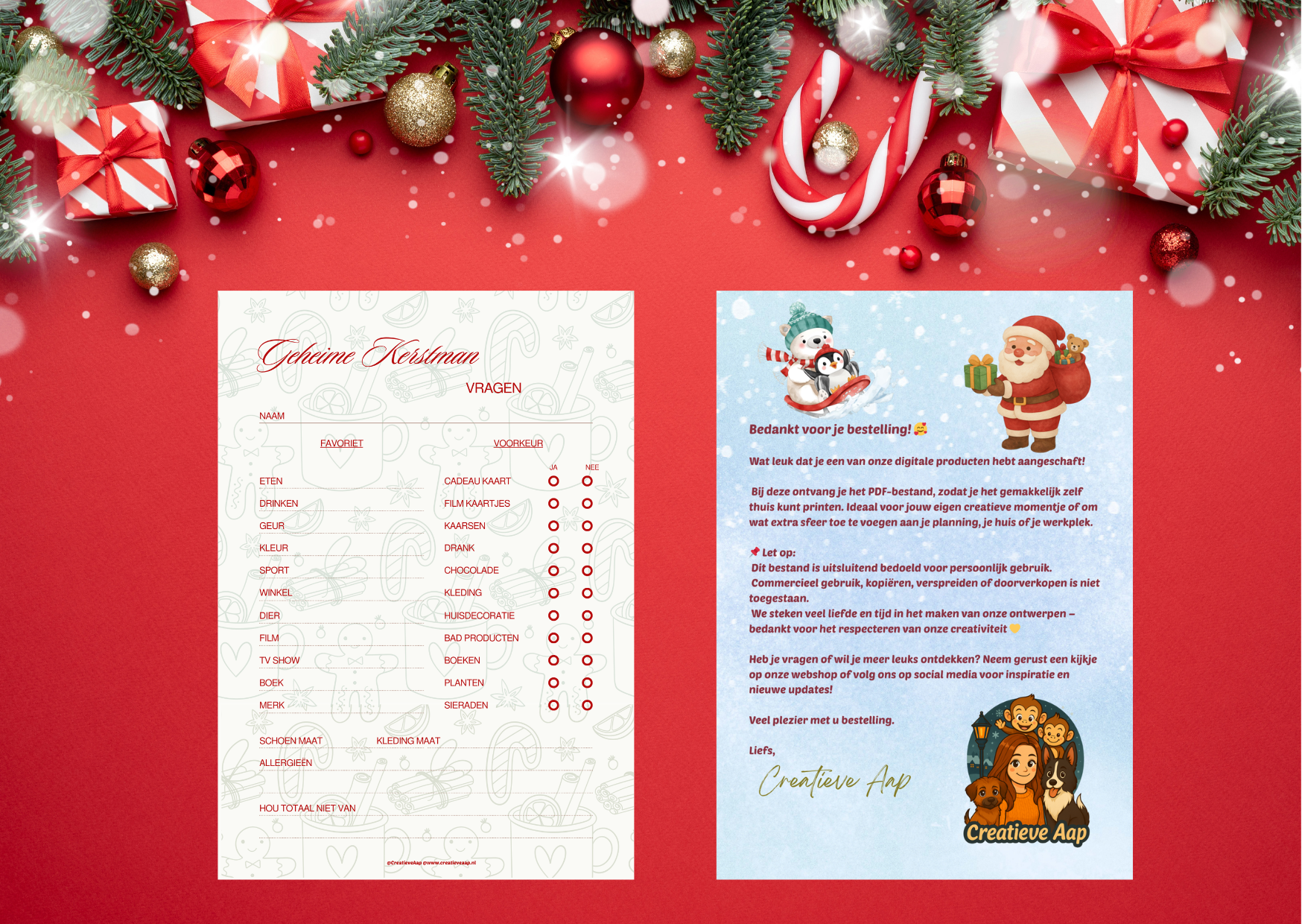 Deze vragenlijst is ontworpen in Creatieve Aap stijl: speels, warm, feestelijk Γ©n stijlvol. De achtergrond bevat subtiele kerstillustraties, en er is een nette lay-out met alle belangrijke categorieΓ«n overzichtelijk bij elkaar.