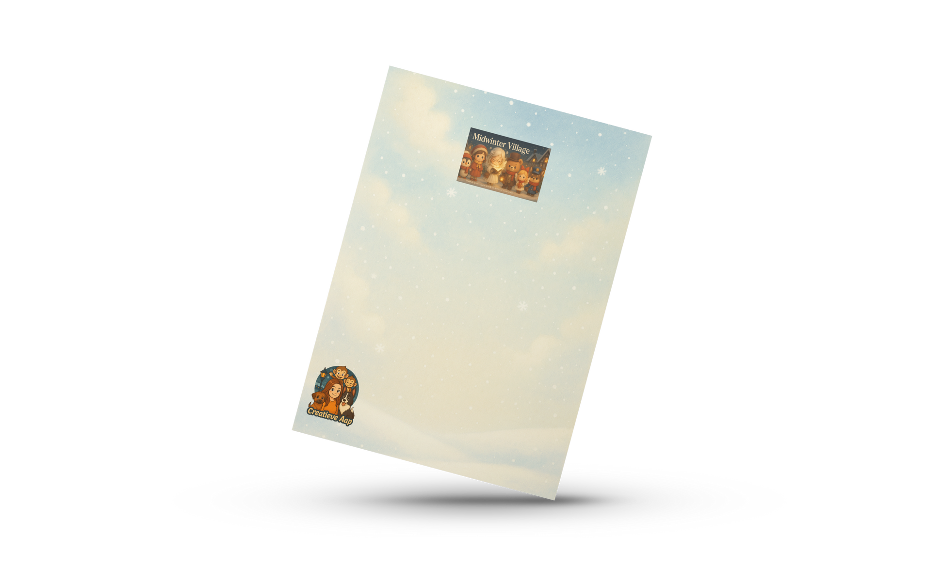 Laat de magie van Midwinter Village jouw kerstpost extra bijzonder maken! Deze hartverwarmende A6 kerstkaart toont een groep vrolijke kinderen, dieren en een kleine engel die samen rond de kerstboom staan — midden in een sfeervol winters dorpje vol lichtjes. Een illustratie die meteen een glimlach oproept en die echte decembergezelligheid in huis brengt.