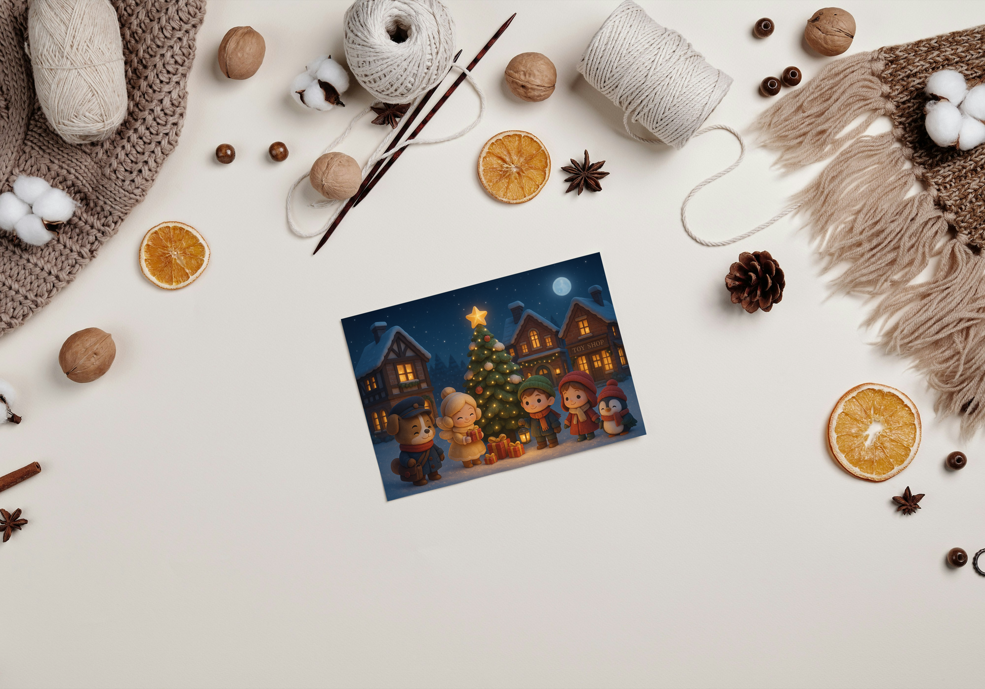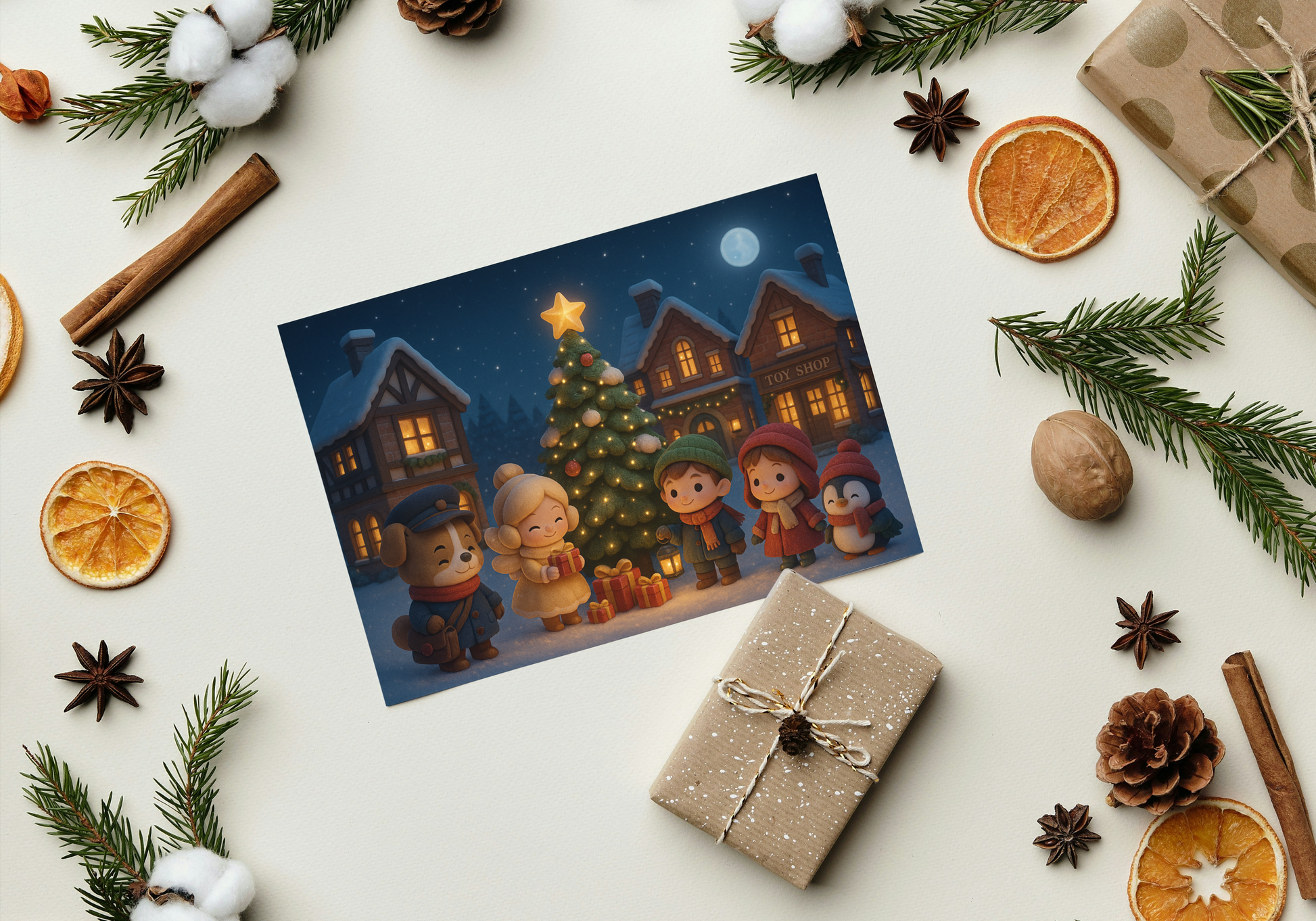 De illustratie toont een knus winteravondje in het dorp: een stralende kerstboom, vrolijke kinderen, een schattige pinguïn én de vriendelijke dorpspostbode. Perfect voor iedereen die houdt van kerstmagie en nostalgische wintervibes.