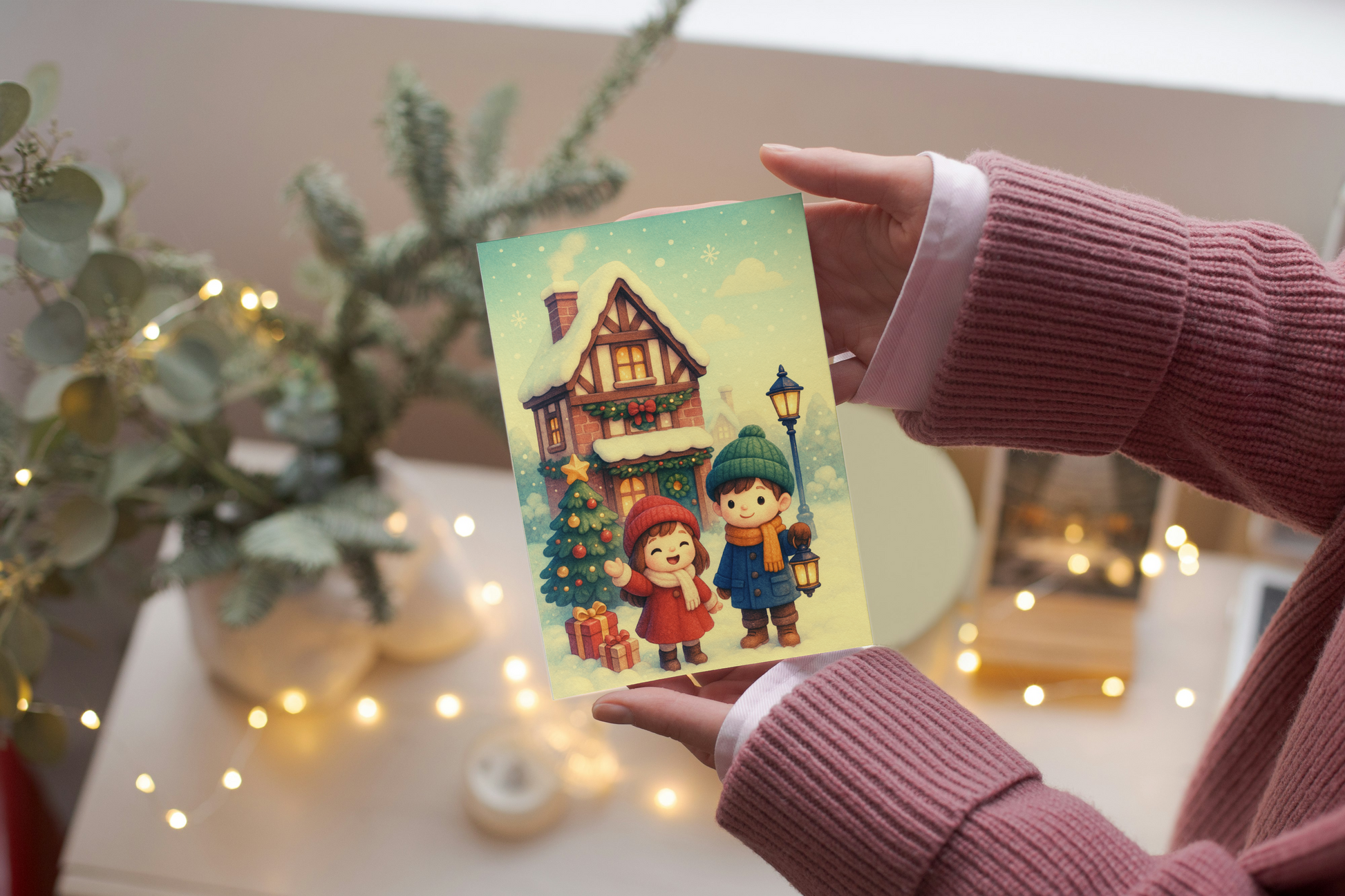 Deze sfeervolle A6 kerstkaart toont twee vrolijke kinderen bij een feestelijk versierde kerstboom en een charmant winterhuisje. Het straalt die ouderwetse, knusse kerstsfeer uit waar iedereen blij van wordt — perfect voor een liefdevolle kerstgroet of gezellige snailmail.