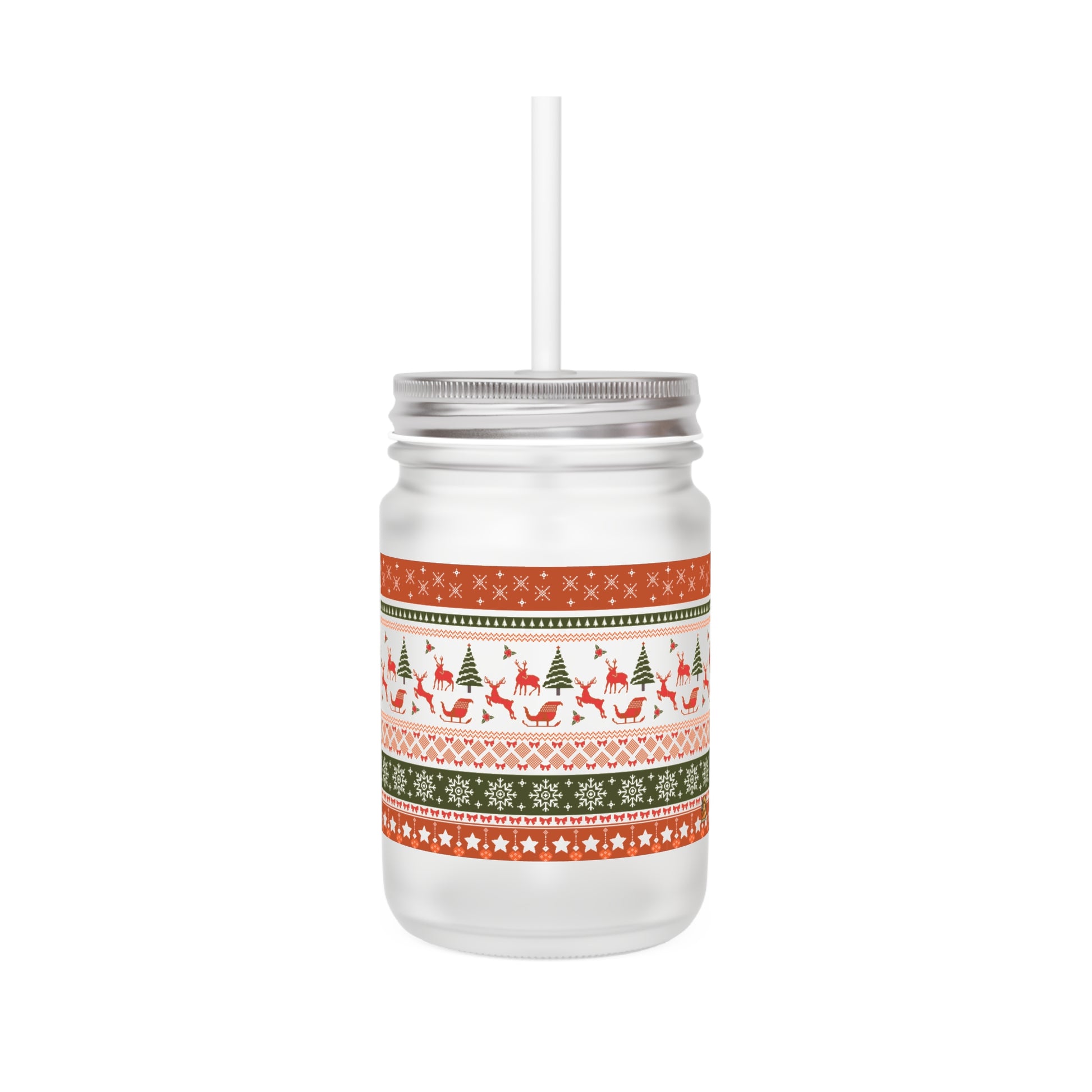 Breng de ultieme decembergezelligheid naar je keuken met deze Kerst Vibes Mason Jar. Het speelse winters patroon met rendieren, kerstbomen en klassieke knitwear-strepen geeft precies dat warme, nostalgische gevoel waar december om draait.