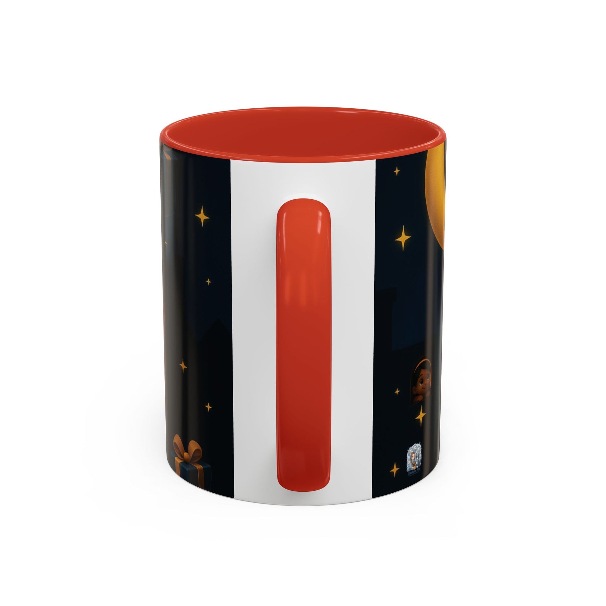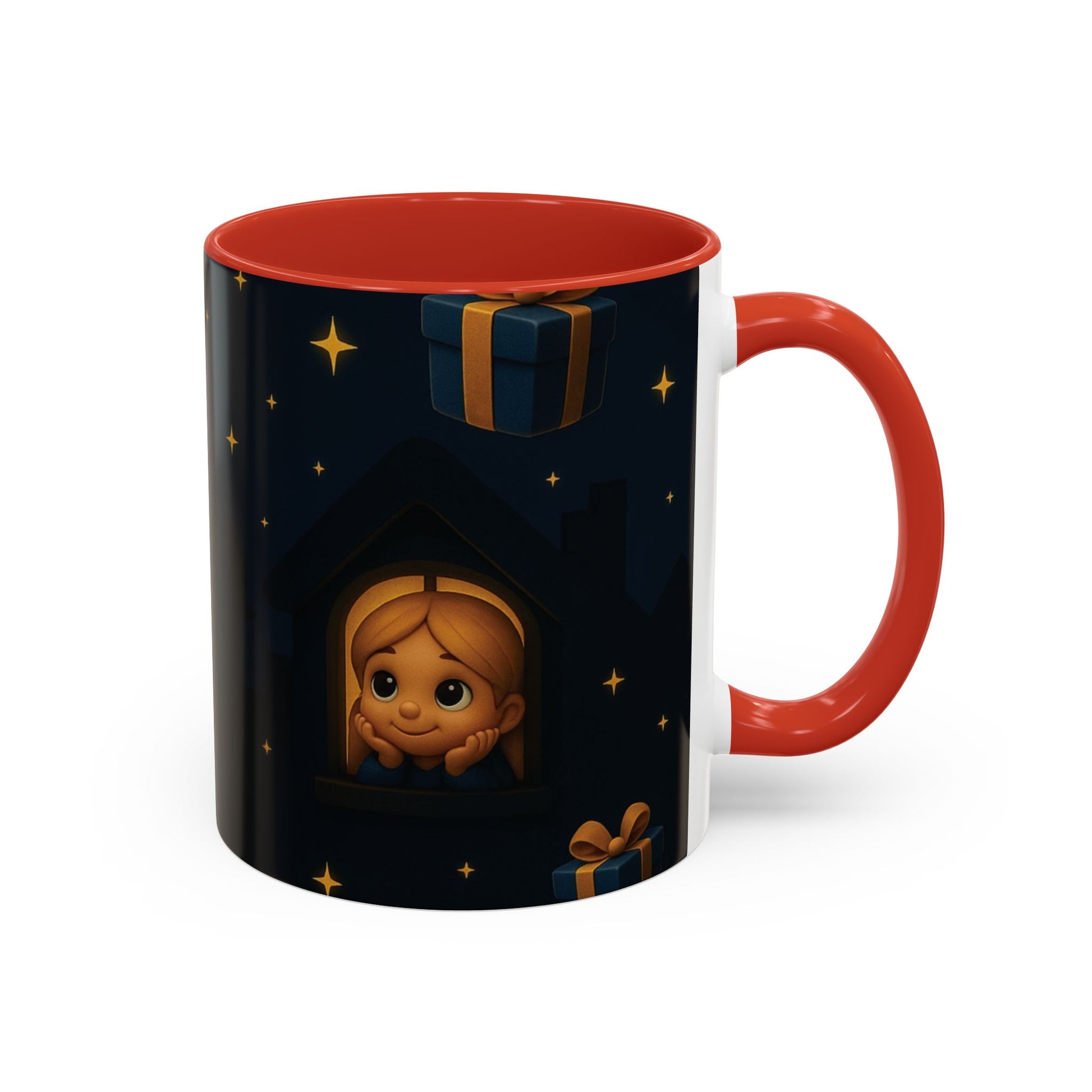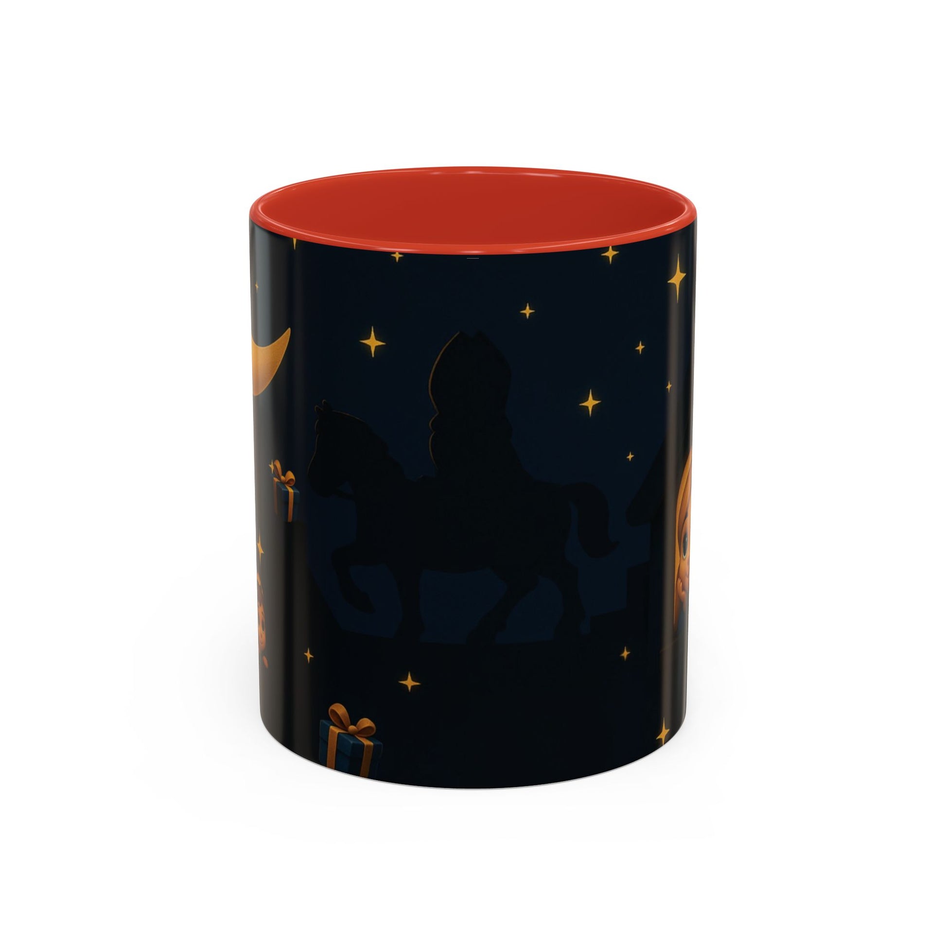 Geniet van je warme chocomelk of koffie tijdens pakjesavond met deze betoverende Sinterklaas Avond mok. Het ontwerp toont een sfeervolle nacht met de maan, vallende cadeautjes en Sinterklaas op zijn paard, terwijl kinderen nieuwsgierig uit het raam kijken. 🌟